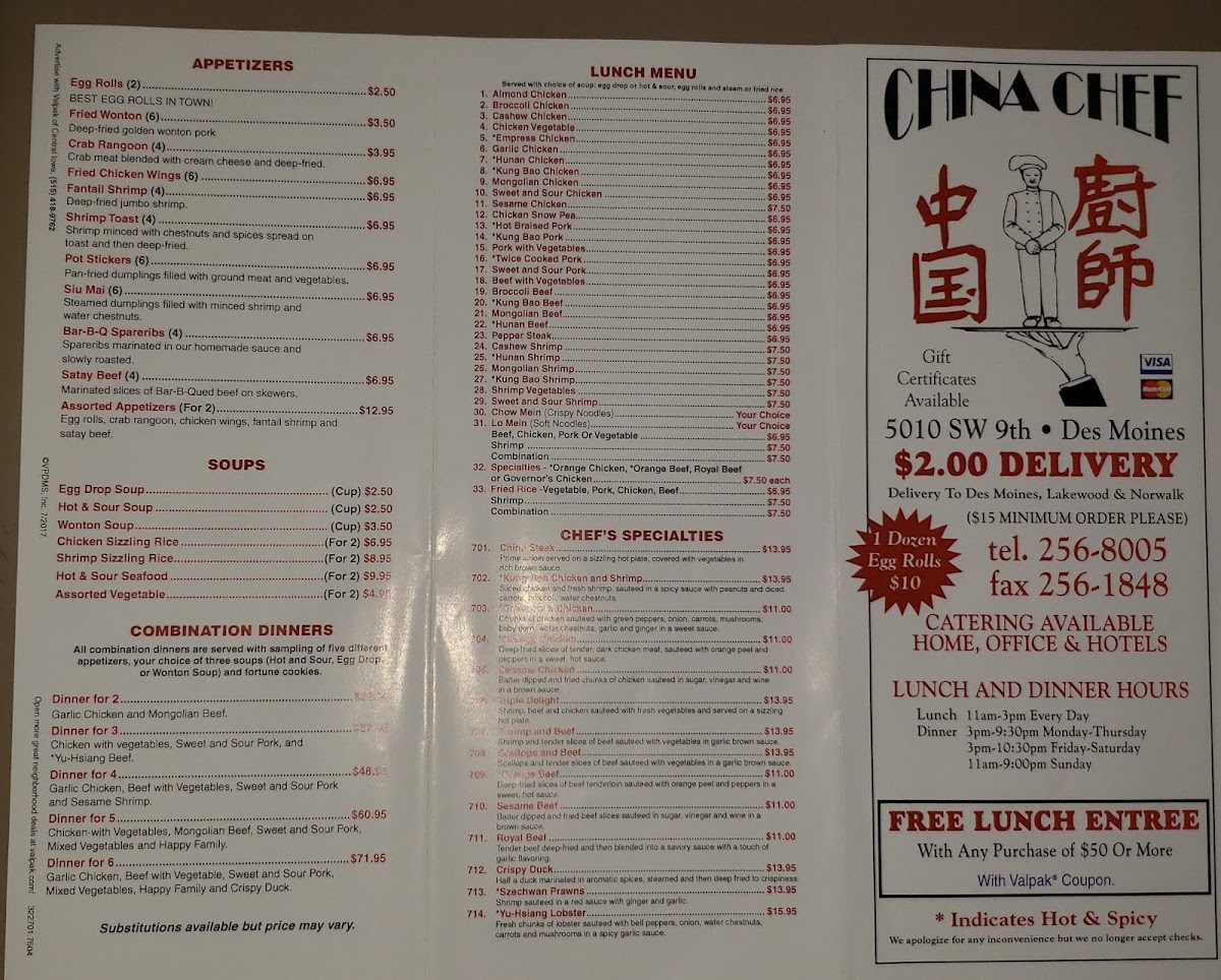 Welcome to China Chef - Des Moines, a hidden gem located at 5010 SW 9th St, offering a delightful escape into the world of authentic Chinese cuisine. The menu brims with enticing options, starting with tantalizing appetizers like crispy Egg Rolls and savory Crab Rangoon, perfect for igniting your taste buds.